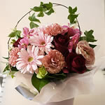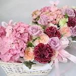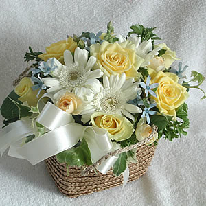 スタイリッシュでカラフルなラウンドアレンジはどんな場面でも色鮮やかに、そして華やかにシーンを彩ります。かわいらしいバスケットにお入れしますので、お見舞いやプレゼントにも喜ばれています。
